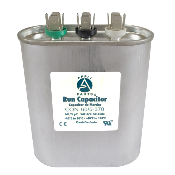 Appli Parts Dual Run Capacitor for ac 60+5 Mfd uF (microfarads) 370VAC CBB65 Oval Universal fit for hvac and other applications 3-1/2in Wide 1-3/4in Depth 4-1/2in High CON-60/5-370