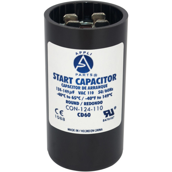 Appli Parts CON-124-110 Motor Start Capacitor 124-149 MFD uF, 110-125 VAC. Universal for Electric Motor Applications, 1.44 in Wide, 2.75 in Height