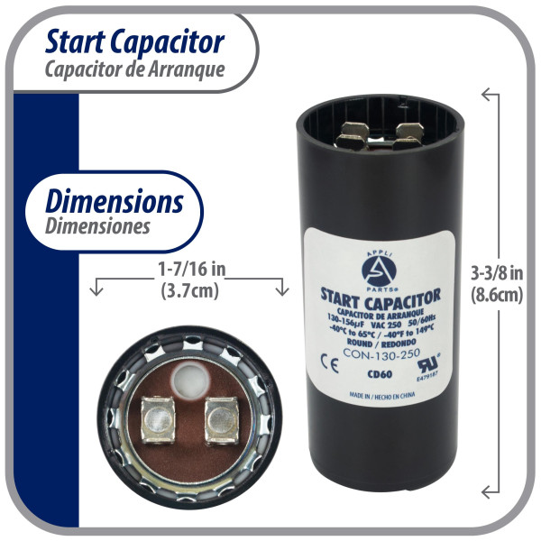 Appli Parts CON-130-250 Motor Start Capacitor 130-156 MFD uF, 250 VAC. Universal for Electric Motor Applications, 1.44 in Wide, 3.38 in Height