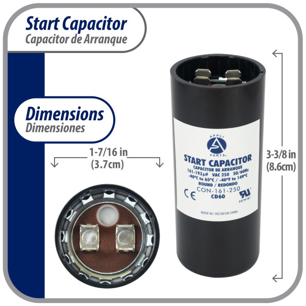 Appli Parts Condensador Capacitor Arranque 161-193 Mfd (microfaradios) uF 250 VAC remplazo universal para motores electricos de distintas aplicaciones 3.7cm Diametro 8.6cm Alto CON-161-250