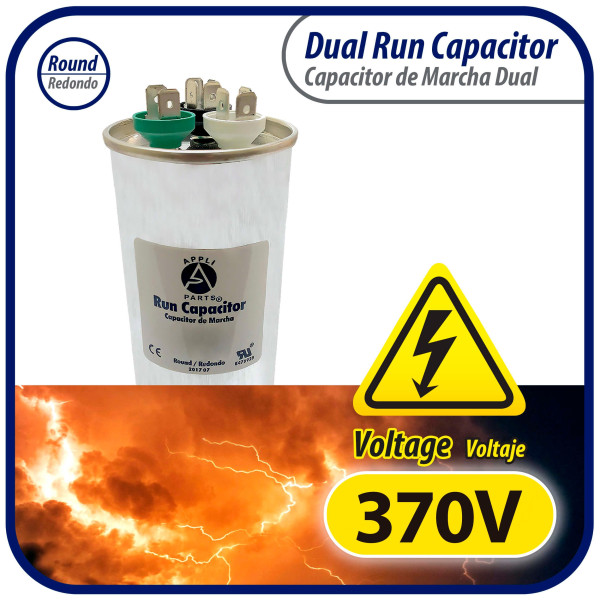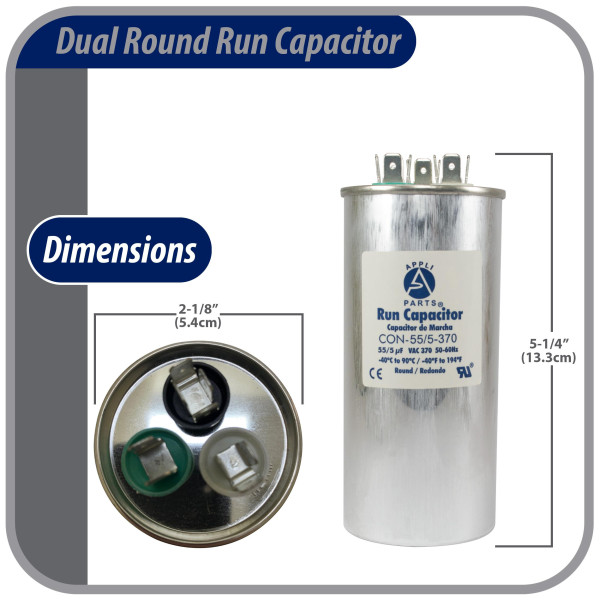 Appli Parts Condensador Capacitor de Marcha 55+5 Mfd uF (microfaradios) 370VAC CBB65 Universal Aire acondicionado y otras aplicaciones Redondo UL E476928 5.4cm Ancho 13cm Alto CON-55/5-370-R